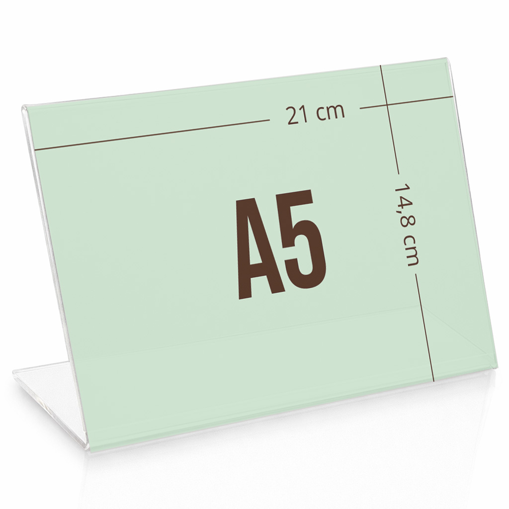 A5 L-Stand menukortholderen i akryl, men en 10° hældning, har mange anvendelsesmuligheder såsom til menukort, bordskilt, infoskilt og prisskilt og er særdeles velegnet til udstilling i butikker og restauranter på bordet, disken eller i udstillingsvinduet.